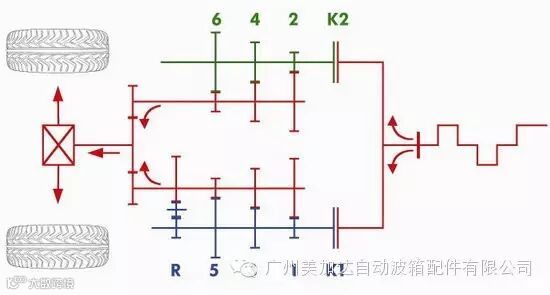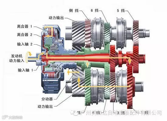 以上图为例,为配合以上运作,它的传动轴运动时被分为两部分,红色部分为实心传动轴,绿色部分为空心传动轴。实心传动轴连接了1、3、5及倒挡,而空心传动轴则连接2、4及6挡,两台离合器各自负责一根传动轴的啮合动作,发动机动力便会由其中一根传动轴传递到车轮上。