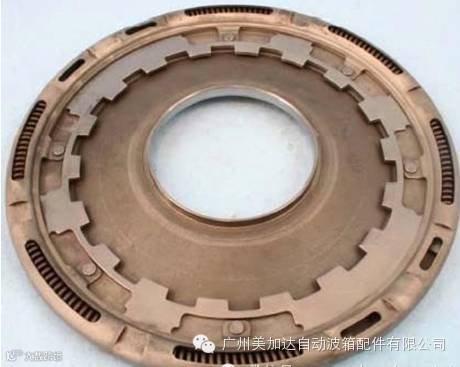 从图2的ATF循环我们还可以做进一步分析,杂质的来源不仅来自于外来的清洗煤油,而且更来自于变速箱内部。杂质的很大一个来源是变速箱内由于不断磨损而产生的金属碎屑和磨擦片的碎屑。金属碎屑来自于磨损的行星轮、磨损的杯士(铜套)、轴承、以及变扭器内的一些垫片或者磨损的锁止活塞以及变扭器前盖内侧。比如,在01M或01N变速箱的油底壳内经常会发现有一些铜的碎屑,这些碎屑有些来自磨损的K1,K2离合器铜套和油泵铜套,而更多的是来自变扭器内的双金属垫片(SONNAX# VW-WB-4,见图3)。如果你在01M/01N油底壳内发现了铜屑,你在剖开变扭器时往往会发现这个双金属垫片上的铜已给磨掉,而且导轮也可能被垫片磨损。变速箱内的磨擦片碎屑既有来自于变速箱内的离合器鼓,也有来自于变扭器内的锁止磨擦片。尤其是锁止磨擦片,它在磨损后产生的碎屑会随着ATF的流动污染变扭器、散热器、阀体和电磁阀。而藏匿这些杂质的最好地方就是变扭器和散热器。变扭器内沟沟坎坎较多,尤其是锁止活塞反面的减震器内(见图4) ,如果不把变扭器剖开进行彻底清洗,很难通过简单的冲洗方法来彻底清洗变扭器。因此,为了确保变扭器是正常的并且是清洁的,国内外标准的变速箱维修流程都规定把变扭器剖开进行翻新。