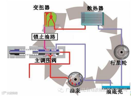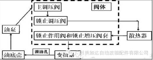以上事例为我们提供了一个很好的典型案例来分析在自动变速箱维修中清洁问题的重要性。大家知道,在自动变速箱运行时,ATF油是不断流动着的。图2显示了大多数自动变速箱中最根本的ATF循环。首先,油泵被引擎带动开始从油底壳中抽取ATF油,油首先进入阀体中的主调压阀,其中的一部份油经主调压阀的调节进入变扭器油路,在进入变扭器前还会经过阀体中的锁止调压阀进行调解。ATF油在流经变扭器后,再流过散热器,注意散热器是在变速箱的外部的,因此这时ATF油已经流出了变速箱,然后再经过散热器的回油管再次流入变速箱,这时的油路称为润滑油路,它用来对行星轮等零件提供润滑,防止其过热烧毁。最后,这些润滑油回到了位于变速箱底部的油底壳,从而完成了一次循环。随着油泵的不断工作,ATF油会周而复始的按以上这个回路进行循环。