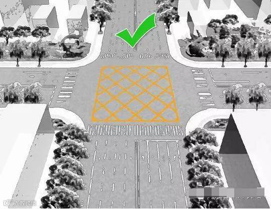 黄色网格线区域代表禁止停车,如果前方红灯时,后方车辆应该避让开此块区域。但在这一区域调头是被允许的,只要中央没有隔离护栏,机动车可以在此区域进行调头。