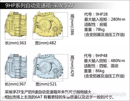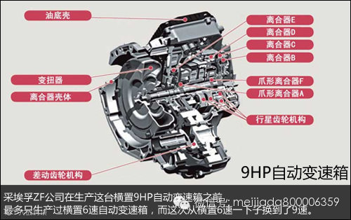 这款“9速”自动变速箱由德国著名变速箱公司采埃孚(ZF)设计研发,其体积和重量并没有因为挡位的增多而进一步增大,反之还向目前6速自动变速箱的体积和重量看齐,而在燃油经济性、换挡平顺性以及响应速度上却要全面优于6AT。在2011年的汽车变速箱国际会议中,采埃孚公布了代号为“9HP28”和“9HP48”两种变速箱将适配于横置发动机的前驱车,最大输入扭矩为280N·m和480N·m。其中“9HP48”的变速箱则还装配在四驱车型和HEV(混合动力车)上。www.gzmjd.cn广州美加达企业