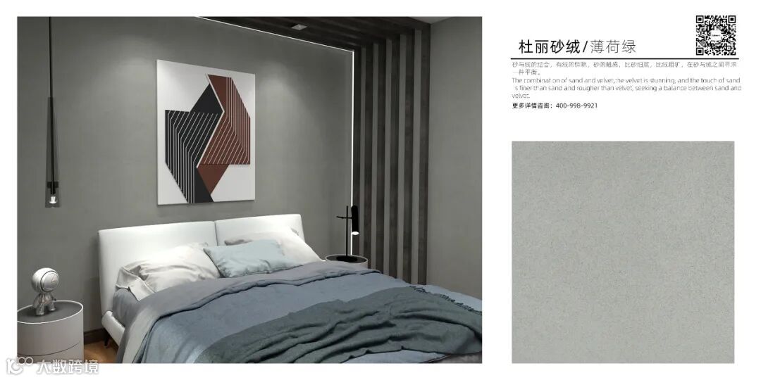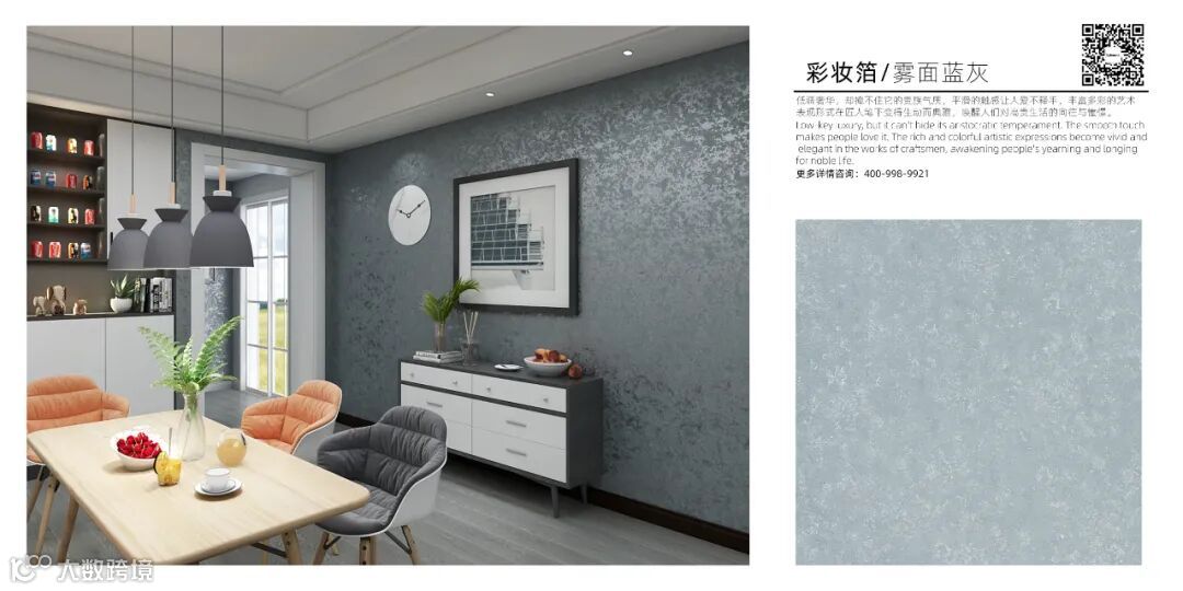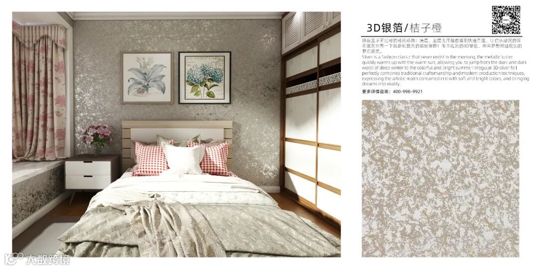 米兰丝绒纹理清晰手感柔和,杜丽砂绒赋予墙面柔滑盈润的丝绒质感,彩妆箔具有饱满的金属色泽,带给人们一种新颖、时尚之感,天鹅绒有着彩虹般的七彩效果,3D银箔能带来强烈的金属质感,丝绸幻彩让墙面如影如幻……
