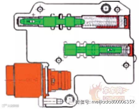 经过仔细分析,我们认为入D挡冲击和5挡降4挡冲击应该是同一问题所致。通过换挡执行元件工作表可知,换挡杆由P、N位移至D位后,启动的主要主动油路是A组离合器的油路,而变速器由5挡降至4挡无非又是重新再次启动A组离合器的油路,因此问题应该在于A组离合器油压上。通过A组离合器工作油路得知,启动油路的油压由控制单元是根据发动机各种工况以及自动变速器的实际运行工况指令主油压调节电磁阀N215来调节的,油压的缓冲控制又是由N215电磁阀控制“压力调节阀”和“减压阀”2个滑阀相互工作来实现的(图2),同时作用在A组离合器油路上的还有节流片和减振装置等,目的均是为实现A组离合器在接合时的平顺运行。