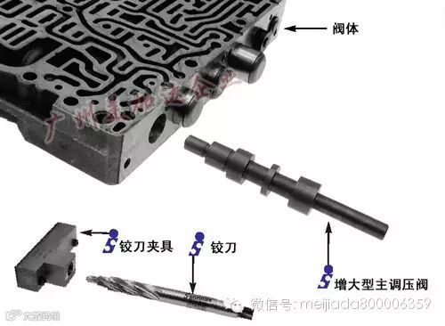 利用阀体万用夹具的工具F-46892-TL对主调压阀孔进行铰孔,然后配以增大型的主调压阀。弹簧可以重复使用原配的弹簧,无须更换。但是滑阀的端塞就须根据实际车型来区别对待了。如果你修的是马自达车,原配的端塞无须更换,可以重复使用。如果你修的是福特的福克斯,因为原配端塞较小,不再适合铰过的阀孔,因此需要丢弃而使用主调压阀修包中附带的增大型端塞。