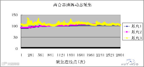 分析至此,故障入手点自然定义在了油温传感器的信号上, 对DSG变速箱共有三个油温传感器,变速箱油温度传感器G93或控制单元温度传感器G510, 内置在变速箱电控单元中,维修手册指出当其感应的油温超过145 °C时,电控系统会停止向离合器供油,使离合器处于断开位置;离合器温度传感器G509(与离合器转速传感器一体), 位于离合器壳体内信号超差时也会触发变速箱保护功能切断离合器的供油,但资料对油温的极限值未给出明确的定义。究竞是哪种传感器产生了切断离合器油路的信号呢?因失速故障为偶发出现,为较准确地监控油温各信号的状态,采用专用测试仪VAG5053对油温变化数据进行动态跟踪,测试结果显示如图表一所示,在2801个连接的测量点的样本中(约1S内3.57个样本),变速箱油温度传感器G93(系列1)和控制单元温度传感器G510采集的温度值(系列2)变化曲线基本保持一致,而变速箱油温度传感器G93所采集的温度值(系列3)动态变化曲线明显地高于其它两油温的变化,在某些点油温较其它两油温竞增高约40度左右;进一步再对离合器安全控制电磁阀N233和 N317的工作状态进行监控,数据显示其电控占空比控制符合换档的的工作特性需要,对比离合器K1和K2的实际工作油压,监控离合器油压控制阀N215和N216也能正常按正比例变化曲线对K1和K2分别进行适时的特性控制(如图二所示),综合以上测试,说明离合器相关电磁阀的工作状态皆未出现异常,尽管未出现测试期间未出现失速的故障(测试后读取08-64组1区仍显示为离合器切断动力传递次数为63次未有增加),但足以说明离合器温度传感器G509传感特性变化异常的事实,分析为G509温度感应电气元件工作特性不稳定引起,尽管G509故障的特性表现为传感信息失准,但在可控温度未超出感应值极限情况下,电脑不会存储G509信号失准的故障记忆,然而一旦超过保护切断界限,系统就会产生中断离合器电磁阀N215和N216的工作指令,从而切断变速箱与发动机的动力传递,此时便会产生失速现象和仪表档位显示异常闪烁现象,为监控便利的需要,系统对切断次数进行相应的次数计数和存储。