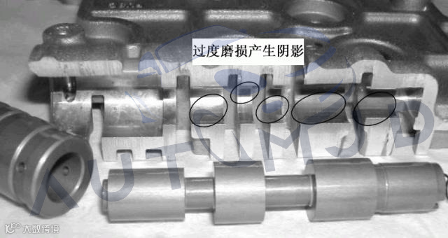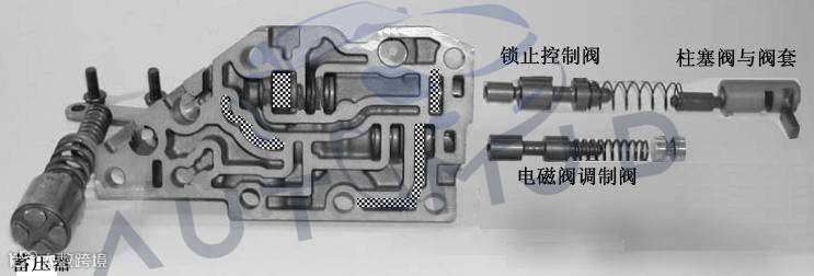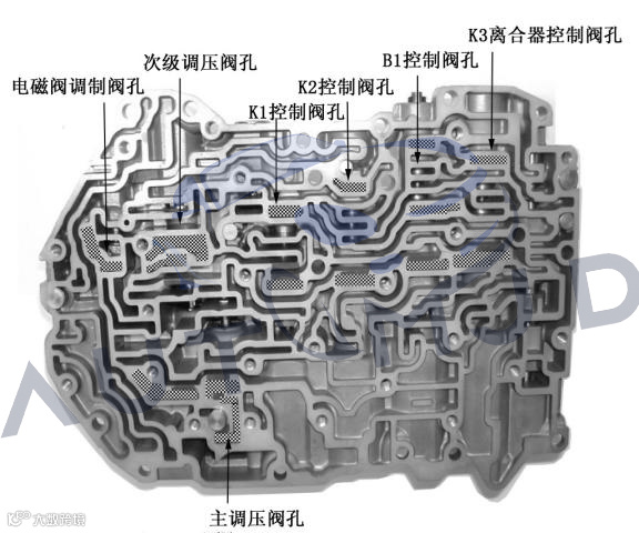 此外,阀体中还有一类滑阀起到对电磁阀供油进行限压控制的作用,这类滑阀在爱信6速变速箱中叫做电磁阀调制阀,这些部位阀孔的磨损会导致对电磁阀的供油出现油压过高或过低,直接影响电磁阀的正常工作,导致各种换挡故障。