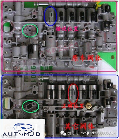 仔细检查阀体过程当中没有发现各阀门有错装现象,对比以前我们维修更换下来的阀体却发现其中一个电磁阀位置肯定是错了见图。后来我们对照原厂维修资料得知位置错误的电磁阀(下图灰颜色插头)位置为系统压力调节电磁阀N93的位置,而灰颜色插头的电磁阀实质为换档电磁阀N92,该电磁阀控制着3/5/R档离合器的接合与分离。因此难免位置搞错后出现其它的问题。