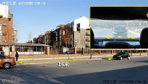 三厢车在前:由于三厢车型坐姿较低,相对来说视线与地面的夹角很小,外加三厢车后窗角度很斜。因此虽然后视镜面积和SUV车型相似,但是真正映射出的视野并不算大,观察后车前杠重叠视线时,辆车相距长达16米。