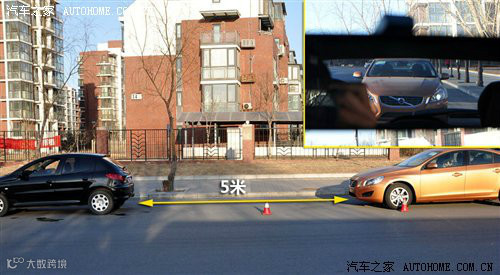 实验方法:我们将三辆车分别停在前方,从后视镜观察后车位置,并且以后车前杠下侧重叠前车后窗下沿,后车大灯重叠前车后窗下沿,后车前挡风下沿重叠前车后窗下沿为参考点,观察驾驶不同车辆距离有无变化。本次使用的测试车为长城哈弗,沃尔沃S60和标致206,选用这三个车主要想检验SUV,三厢车,两厢车对于内后视镜把控距离的效果是否一致。