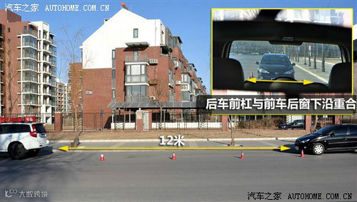SUV在前:SUV车身较高,视线自然不错。此时内后视镜可将后窗完全映射在镜片内,虽然后窗面积不小,但是后窗的下沿并不低,这样就造成反射视线相对较平,当后车前杠重叠视线后,此时两车距离为12米。