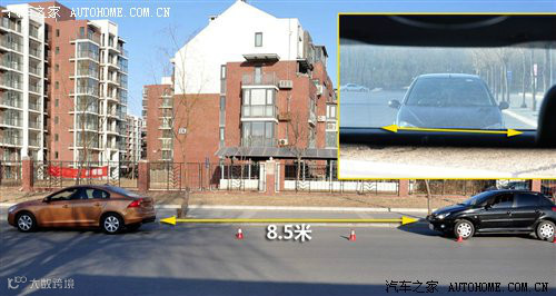 三厢车在前:对于三厢车来说,倾斜的后窗多少会影响视觉上的判断,虽然同样是挡风玻璃下沿重叠视线,但是考虑到视线和三厢车突出的尾部,此时辆车相距仅1.5米。