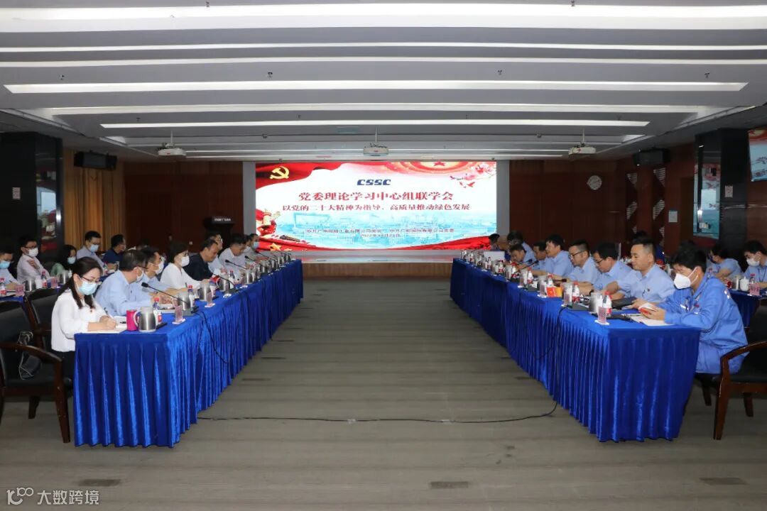 在党委理论学习中心组联学会上,双方共同认真学习了党的二十大报告中关于绿色发展的重要内容,双方领导班子成员围绕“以党的二十大精神为指导,高质量推动绿色发展”进行了深入的交流研讨。广船国际总监林明作了题为《以双碳目标为指引,高质量建设绿色工厂的研究》的课题介绍。
