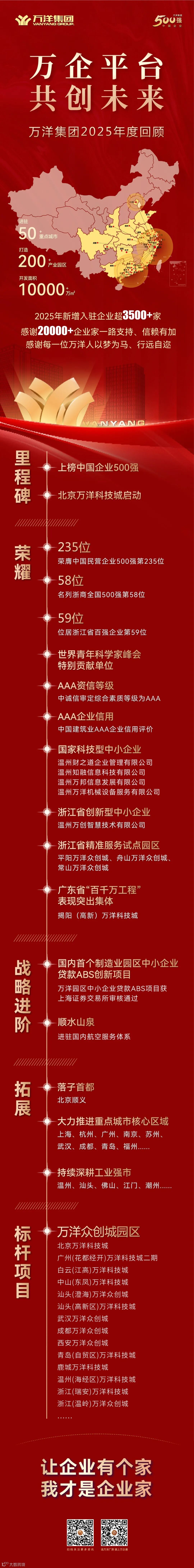 万洋集团创立于1998年,是一家制造业集聚平台运营商和中小企业集群服务商,中国民营500强企业。集团拥有投资开发、产业招商、建设施工、园区运营和金融服务的园区全产业链体系,下设万洋众创城、万洋建设、万洋智慧运营、万洋金融等业务板块。