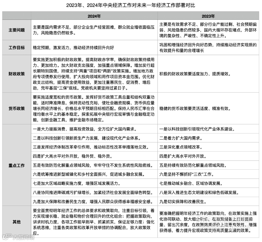 对比2023年中央经济工作会议,今年的会议在财政政策方面直接提出“提高财政赤字率”。