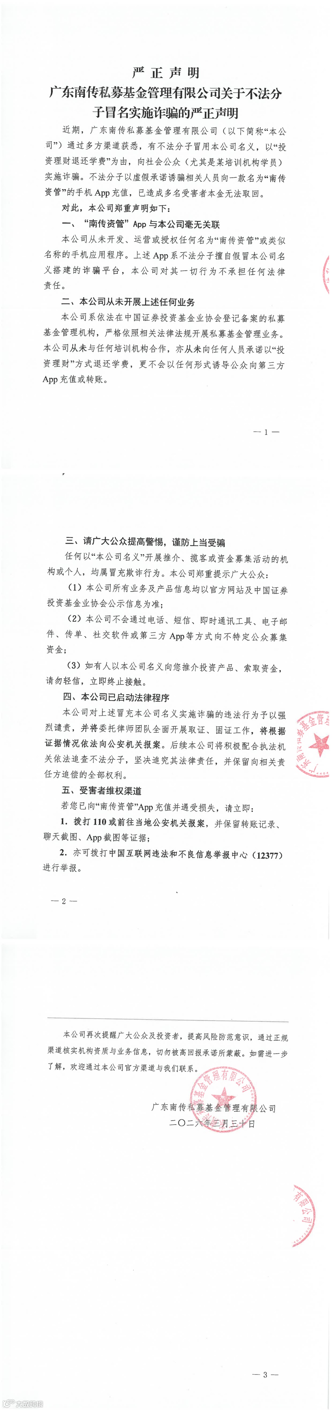 近期,广东南传私募基金管理有限公司(以下简称“本公司”)通过多方渠道获悉,有不法分子冒用本公司名义,以“投资理财退还学费”为由,向社会公众(尤其是某培训机构学员)实施诈骗。不法分子以虚假承诺诱骗相关人员向一款名为“南传资管”的手机App充值,已造成多名受害者本金无法取回。