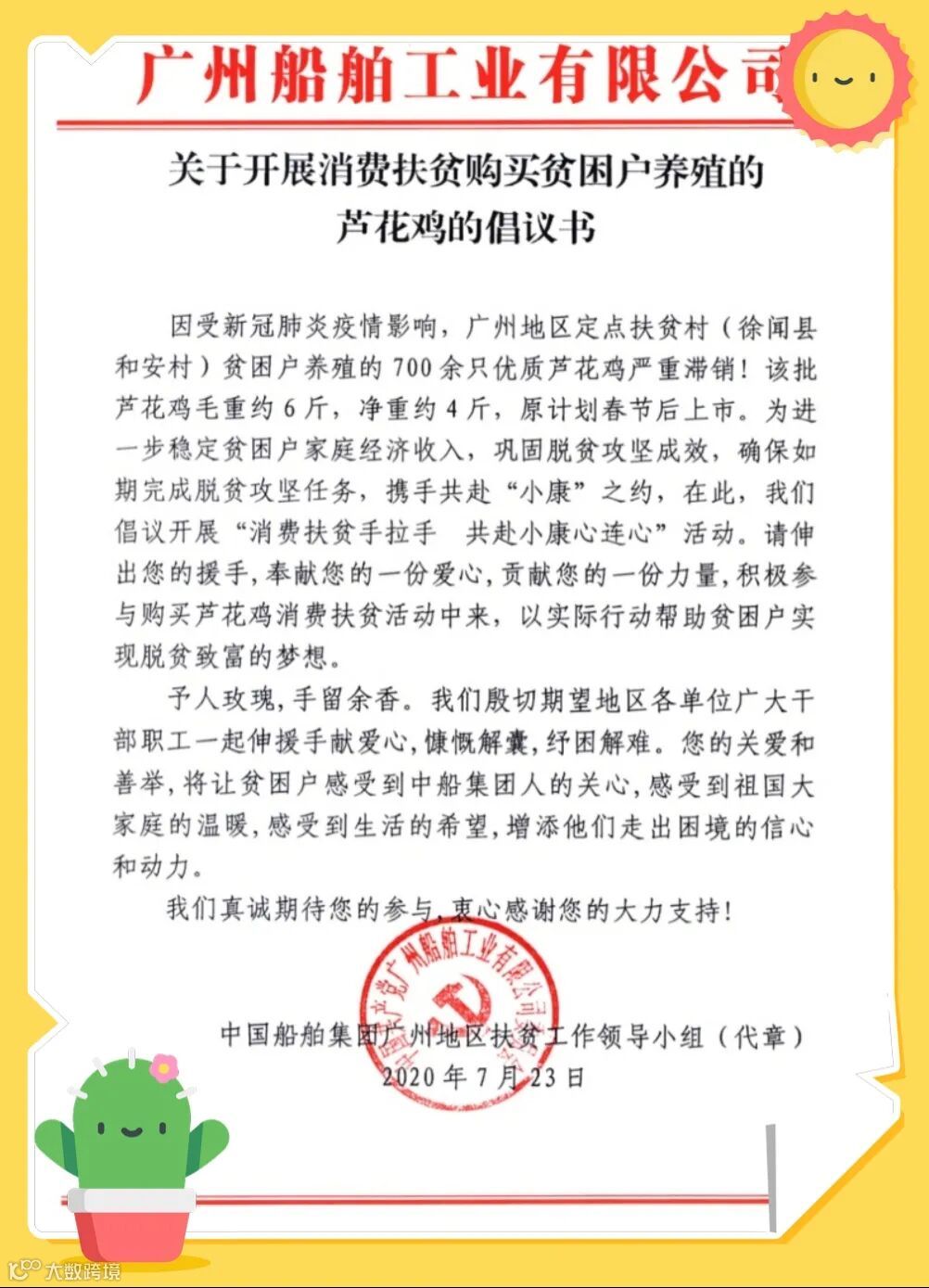 近日,中国船舶集团旗下广州公司组织开展“消费扶贫手拉手,共赴小康心连心”倡议活动,动员地区驻穗各单位广大干部职工购买湛江和安村芦花鸡,帮助和安村贫困户共渡难关。