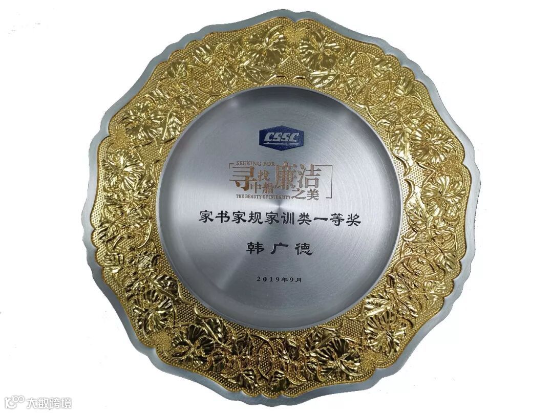 韩广德获颁“寻找中船廉洁之美”一等奖牌匾