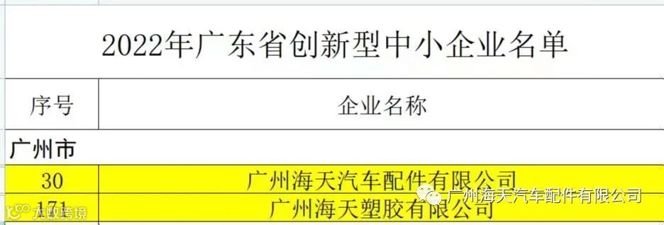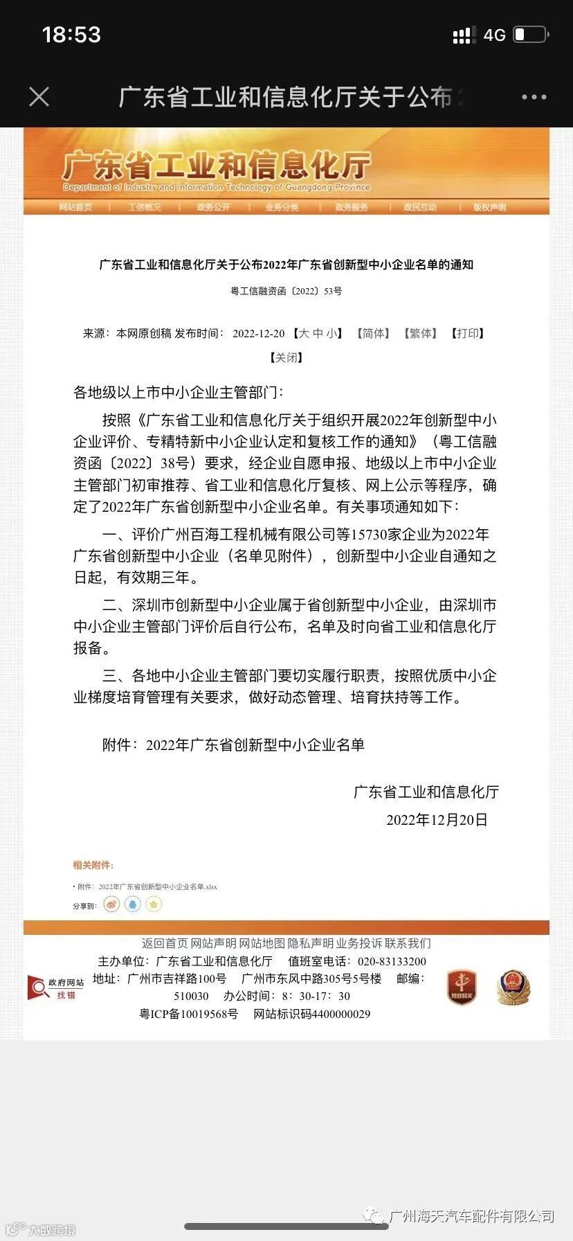 感谢政府各届领导对海天的支持与认可,感谢所有客户对海天的信任,感谢合作伙伴们的大力支持。2023年开年之际,广州海天汽车配件有限公司收获两项荣誉:通过“省专精特新中小企业”认定和评定为“广东省创新型中小型企业”荣誉。海天会一如既往为客户持续奋进,高质量完成产品交付、质量管控、用心服务好客户。