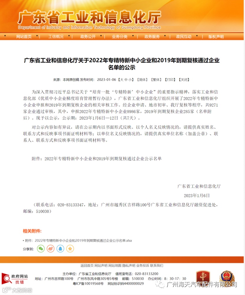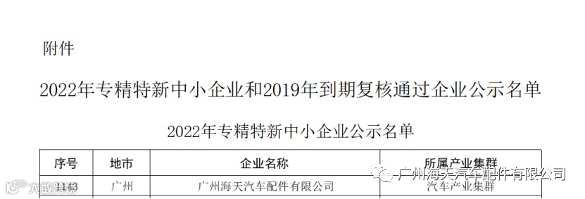 广州海天汽车配件有限公司通过“省专精特新中小企业”复核!