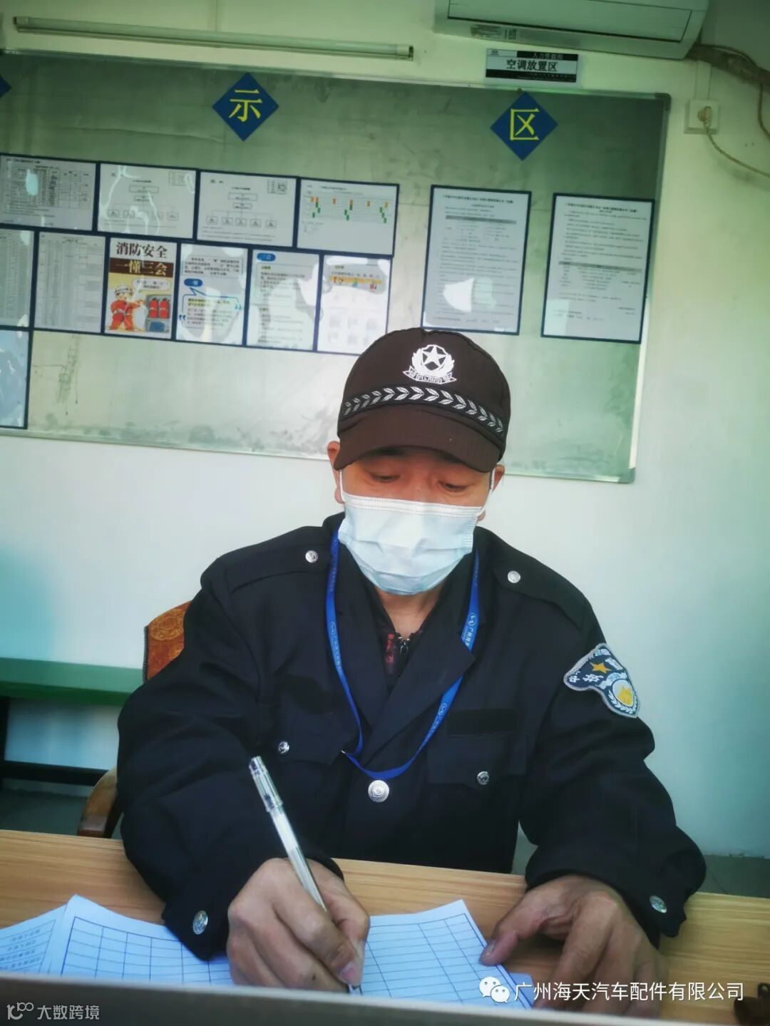 2017年8月份入职,入职的时候,海天汽配厂房正在筹建中,车间无门窗、园区无大门,为保障公司的财产安全,待车间组装设备的同事下班后,他把所有值钱的配件全部集中在一堆,用一块布盖着,拿石头压着,通宵不合眼的守着那堆值钱的宝贝,从入职到今,他值班期间从未发生过被盗事件。