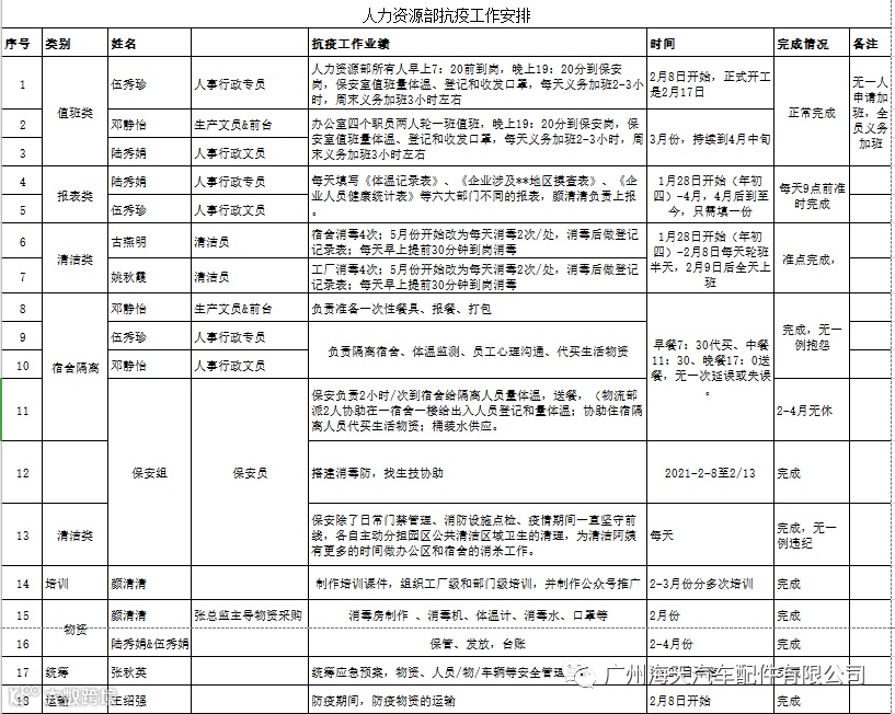 1月28日起,张总监带着我们采购物资;人力资源部全员在张总监的带领下,提前9天上班,从2月8日起全部门在工厂待命做复工复产前的准备工作,给予返厂人员安排宿舍隔离、每日监测体温、一日三餐配送、日用品的配置、搭建消毒房、制作隔离区、消杀工作区域、沟通安抚等工作。