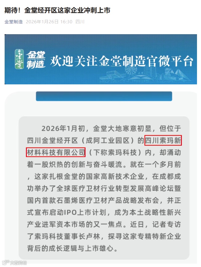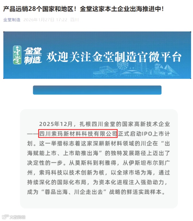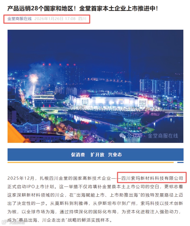 近期,金堂县官方媒体对四川索玛新材料科技有限公司的发展动态予以了连续、多角度的报道,从资本市场规划到国际化拓展,生动记录并展现了索玛科技作为本土创新企业的成长活力与坚实步伐。