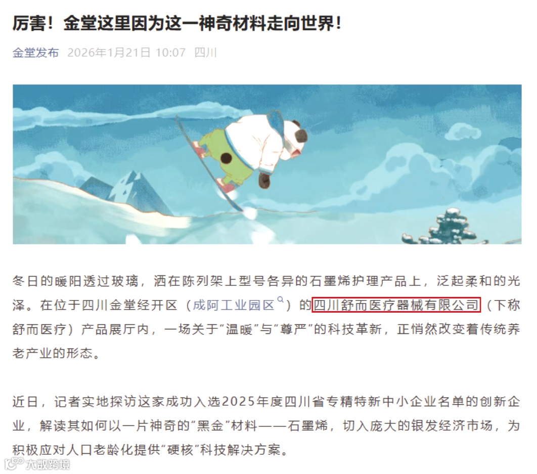 在另一篇报道《厉害!金堂这里因为这一神奇材料走向世界!》中,舒而医疗则讲述了以“硬核科技”服务“银发经济”的温暖故事。