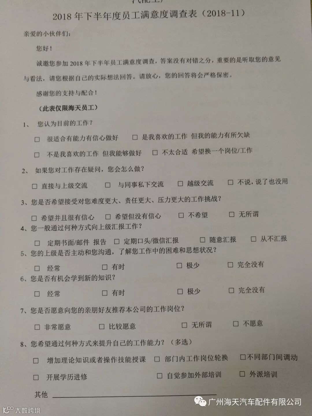 诚邀您参加2018年下半年员工满意度调查,答案没有对错之分,重要的是听取您的意见与看法,请您根据自己的实际想法回答。请放心,您的回答将会严格保密。