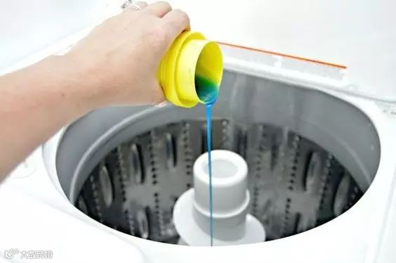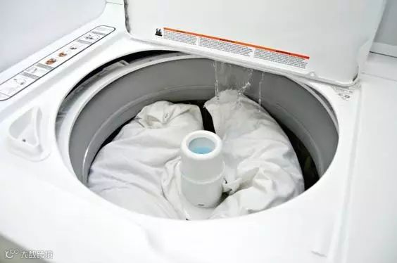 步骤二:在洗衣机中加入洗衣粉、漂白水和蹦沙,混合以后,将枕头放入洗衣机中开始清洗。