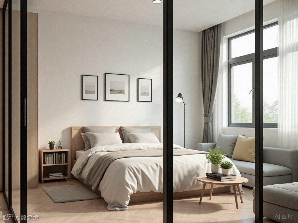 如果有些朋友想要有卧室与客厅分开的感觉的话,那可以考虑用家具隔断。比如说在两个空间的连接处放置一张三人位沙发,就可以区分出卧室和客厅的感觉了。