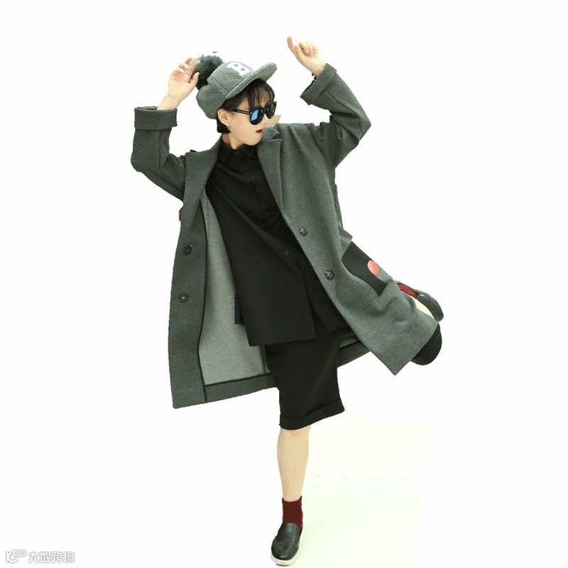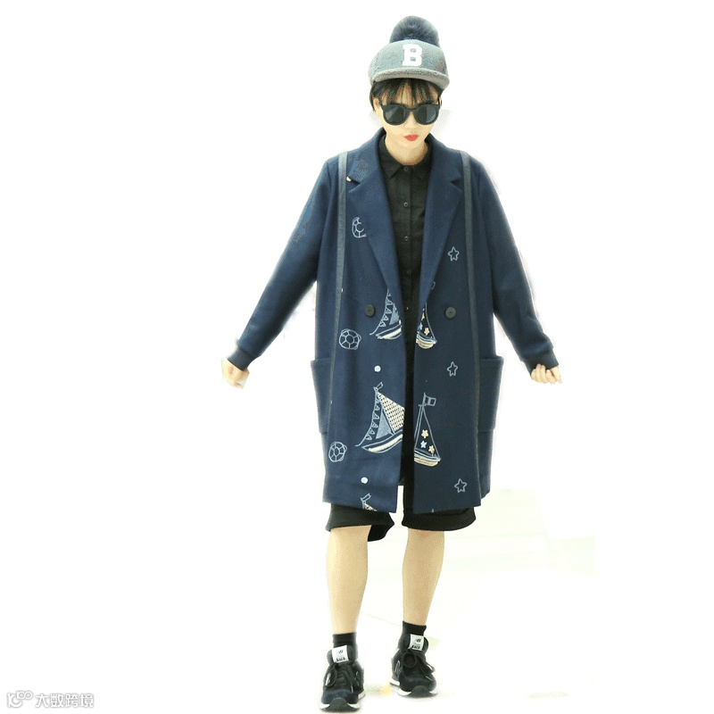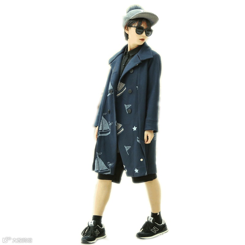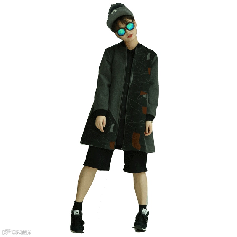 穿插在线条之中的图案,似乎是在波浪中前行,类似棒球服的长大衣,酷感十足。
