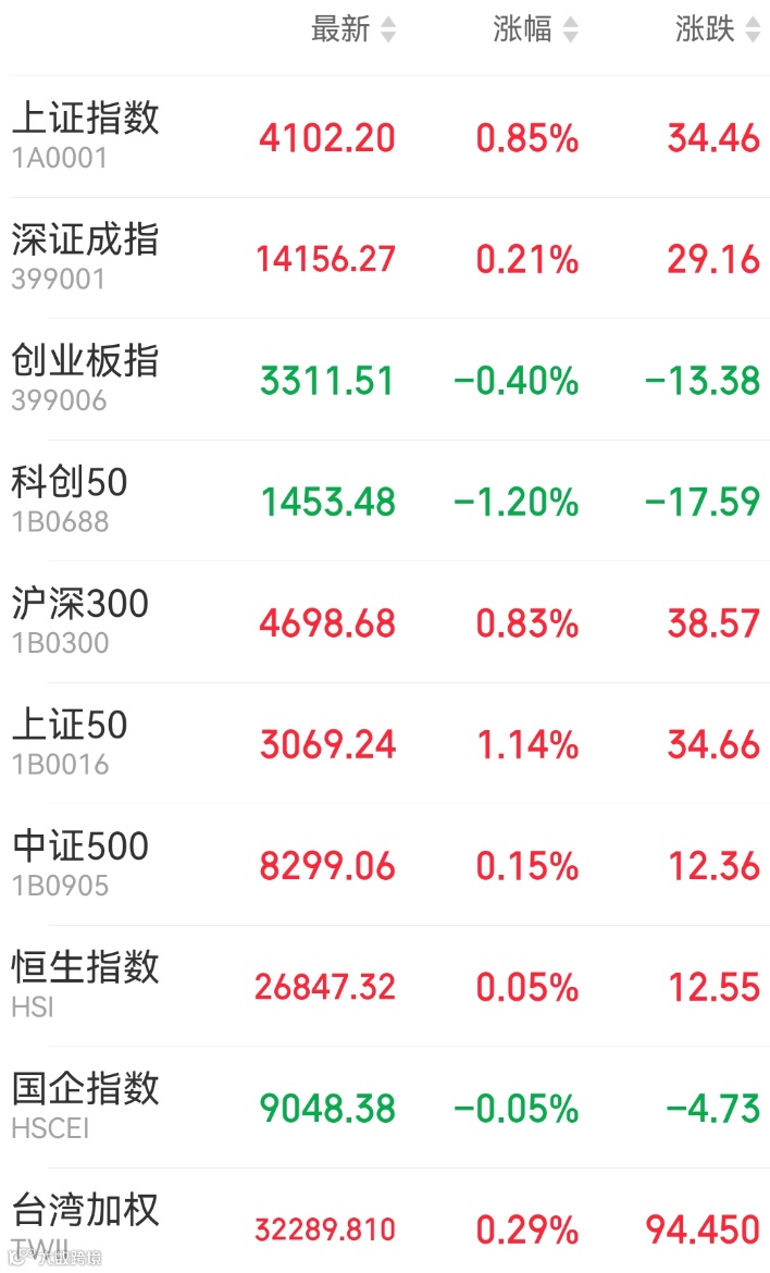 1、A股:周三A股先抑后扬,上证指数收涨0.85%报4102.2点,深证成指涨0.21%,创业板指跌0.4%,万得全A涨0.45%,市场成交额降至2.5万亿元,上日为2.57万亿元。煤炭、光伏板块掀涨停潮,大消费、地产板块活跃,半导体、算力硬件、AI应用板块则陷入低迷。