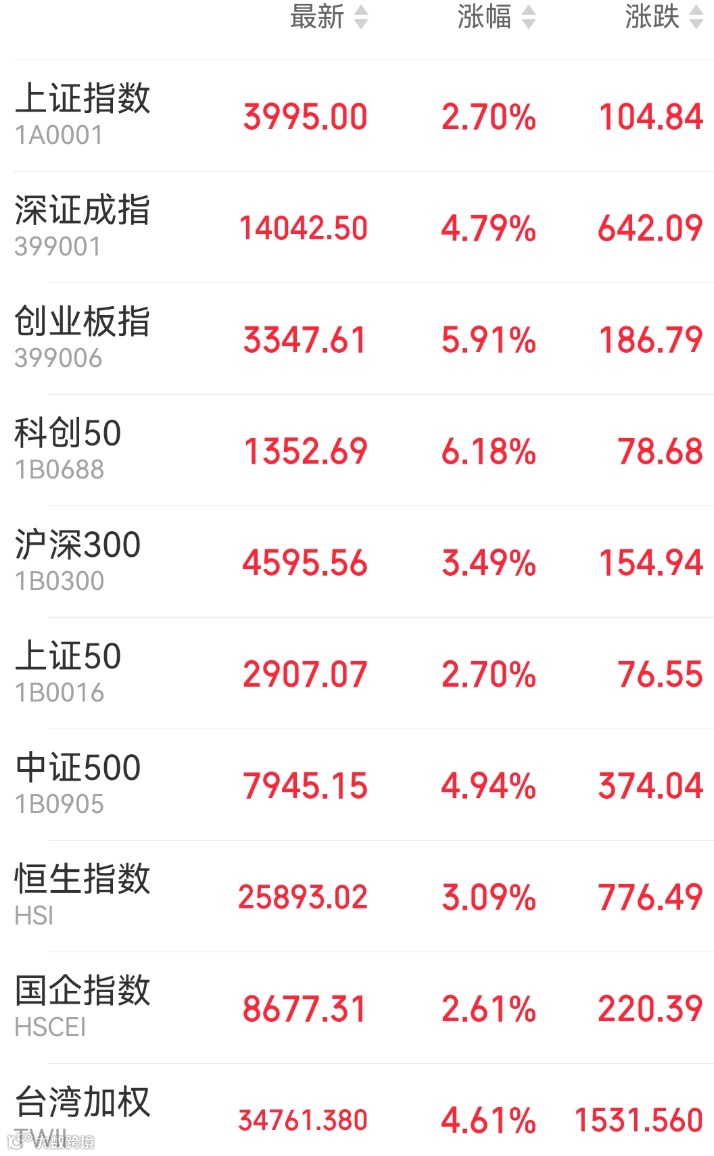 1、A股:A股强势反弹,上证指数收涨2.69%报3995点,深证成指涨4.79%,创业板指涨5.91%,万得全A涨4.05%,市场成交额放大至2.45万亿元。市场逾5100股上涨,科技股全线大涨,AI产业链、半导体设备、商业航天概念涨幅居前;油气股全线走低。