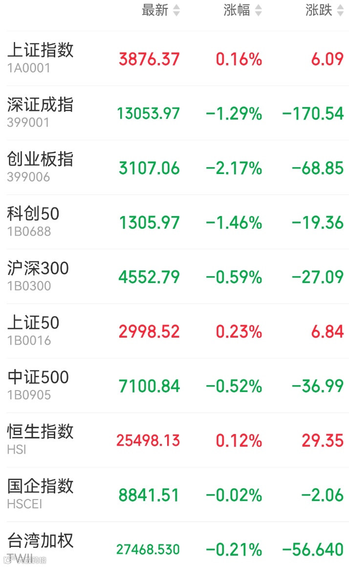 1、A股:A股大小指数分化,上证指数收盘涨0.16%报3876.37点,深证成指跌1.29%,创业板指跌2.17%,市场成交额1.68万亿元。商业航天概念股强势,军工股、光刻机概念异动,医药商业表现活跃;大消费持续走高,零售、食品饮料方向领涨。稳定币、光伏、炒股软件、储能、CPO题材走弱。