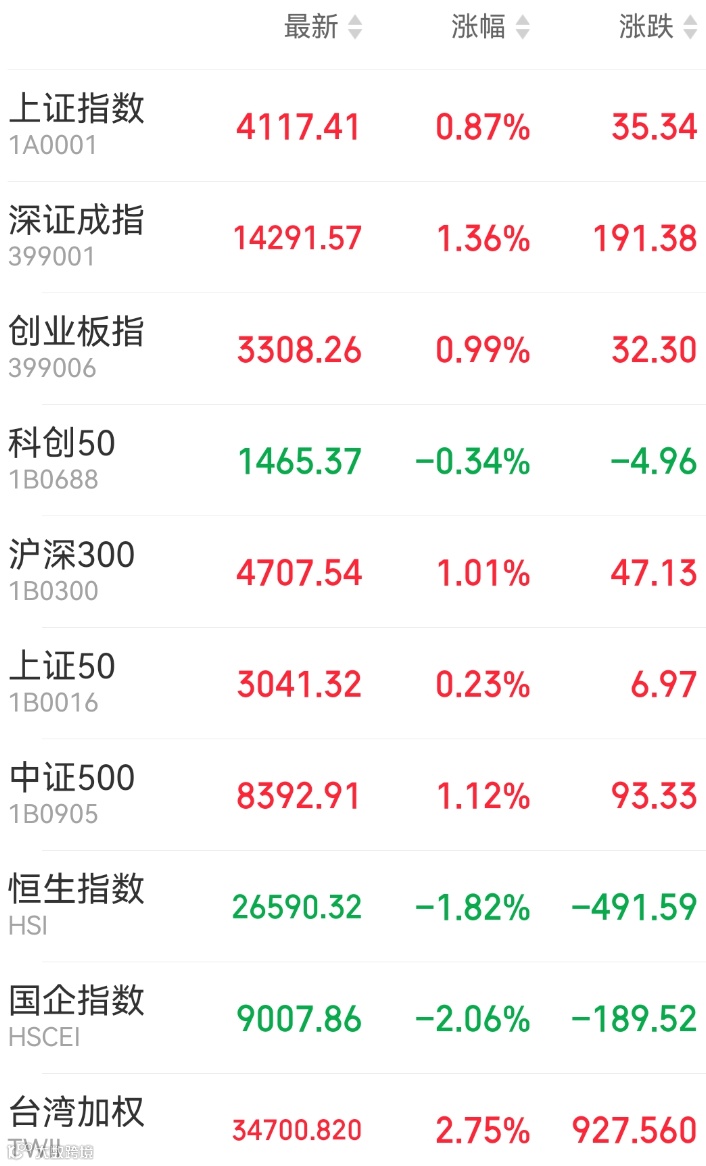 1、A股:A股马年“开门红”,上证指数收涨0.87%报4117.41点,深证成指涨1.36%,创业板指涨0.99%,万得全A涨1.06%,市场成交额2.22万亿元。石油天然气、黄金、化工等资源周期股全线大涨,电网设备、算力硬件股走强,影视股、AI应用题材股大幅回调。