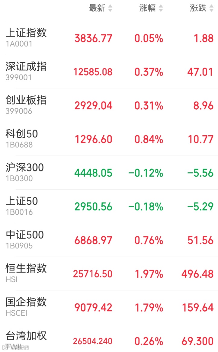 1、A股:A股震荡上涨,军工题材活跃,AI应用、风电、商业航天概念表现活跃,锂矿方向深度回调,海南本地股冲高回落。截至收盘,上证指数涨0.05%报3836.77点,深证成指涨0.37%,创业板指涨0.31%,市场成交额1.74万亿元。