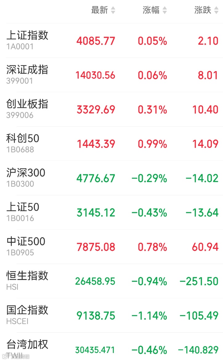 1、A股:A股震荡上涨,上证指数收涨0.05%报4085.77点,实现14连阳,续创史上最长连阳纪录。万得全A涨0.19%,深证成指涨0.06%,盘中创近4年新高,创业板指涨0.31%,盘中创逾4年新高。市场成交额2.88万亿元。半导体产业链全线崛起,光刻机、存储器方向领跑。煤炭股、稀土永磁、可控核聚变概念走强。脑机接口概念大幅回调。