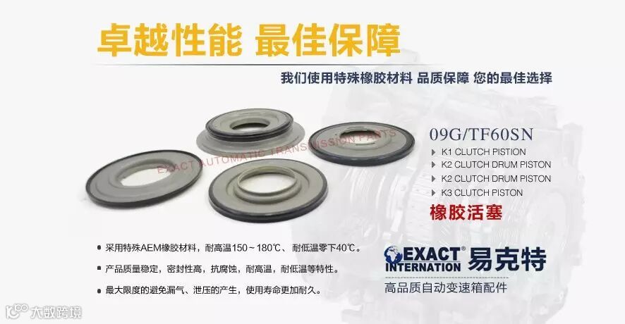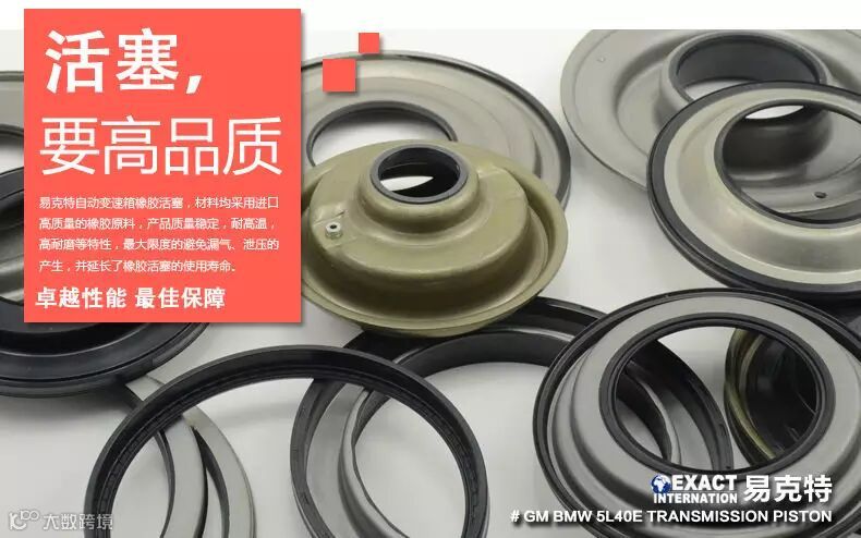 易克特自动变速箱橡胶活塞,材料均采用进口高质量的橡胶原料(乙烯丙烯酸酯橡胶(AEM),氟橡胶,硅橡胶等),其温度可达到180℃,远远超过变速箱140℃正常工作温度要求,所有产品质量稳定,耐高温,高耐磨等特性,最大限度的避免漏气,泄压的产生,并延长橡胶活塞的使用寿命。