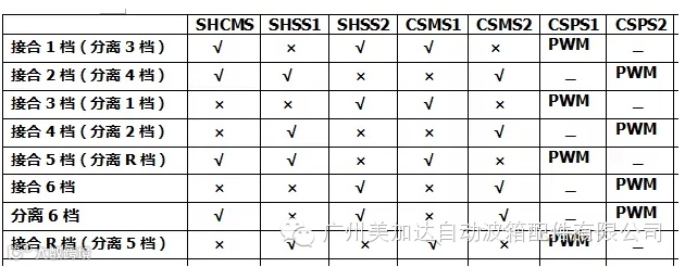 √=工作 ×=不工作 PWM信号调节 —=工作状态与换挡机构不相关联