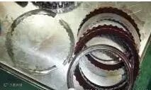将控制阀体拆下,重点检查了离合器选择阀,3-5-R离合器调压阀,R1/456离合器调压阀,均未见异常。经客户同意将变速器解体检查,发现3-5-R离合器波形片已经断为三段,3-5-R离合器片未烧片(如图2所示),同时发现3- 5-R和4-5-6离合器壳体上的3-5-R离合器钢片导槽已经划伤(如图3所示) , 更换3 - 5 - R 离合器波形片及3-5-R和4-5-6离合器壳体,试车,故障排除。