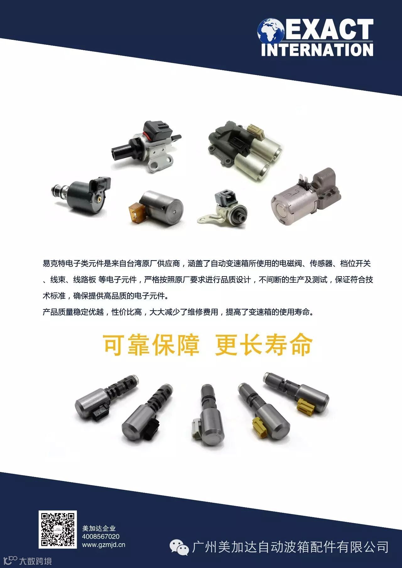 易克特电子类元件是来自台湾原厂供应商,涵盖了自动变速箱所使用的电磁阀、传感器、档位开关、线束、线路板等电子元件,严格按照原厂要求进行品质设计,不间断的生产及测试,保证符合技术标准,确保提供高品质的电子元件。产品质量稳定优越、性价比高,大大减少了维修费用,提供了变速箱的使用寿命。