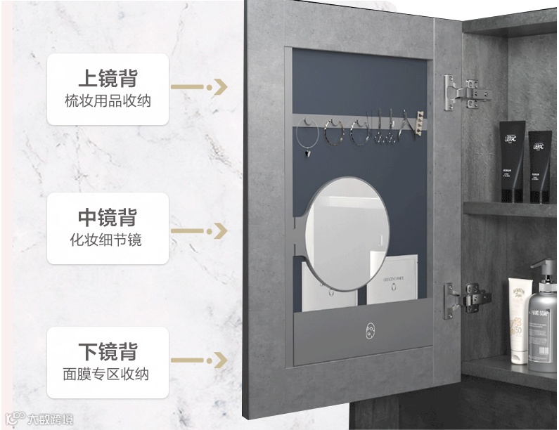 让化妆品有更好的放置之处,镜背设置专区收纳,摆放整齐随取随用,在浴室也能轻松护肤化妆。