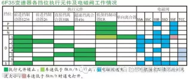 6F35变速器各挡位执行元件及电磁阀工作情况如表所示。