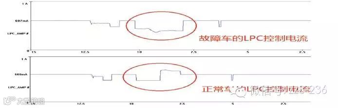 能够导致主油压异常的原因有:阀体故障,LPC电磁阀(主油压控制电磁阀)故障,PCM对LPC电磁阀的控制异常。还是本着从简到繁的原则,首先利用诊断仪对比检查LPC电磁阀的控制电流曲线,发现异常,如图10所示。
