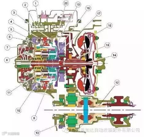1. 电磁阀体 2. 阀体 3. 前进挡制动器12344. 低倒挡制动器LR 5. 制动器26 6. 单向离合器 7. 直接挡离合器35R 8. 超速挡离合器456 9. 后行星排 10. 中间行星排 11. 前行星排 12. 主减速器行星架和差速器总成 13. 从动链轮 14. 输入轴总成 15. 油泵总成 16. 变矩器17. 主动链轮 18. 传动链 19.P 挡锁止机构齿轮 20. 锁销
