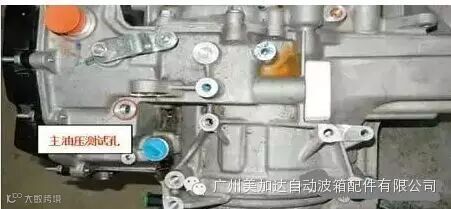 PCM控制SSA的电流是正确的,在假定电磁阀压力调节阀功能正常的情况下,SSA电磁阀控制压力也应该是正常的,那么前进挡制动器的不正常接合可能是由于在挂入D挡时液压控制系统的主油压不正常造成的。测量系统主油压(测量孔如图6所示)时发现换挡杆挂入D挡后主油压与正常车辆不同。