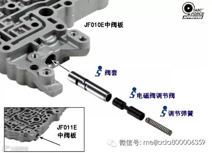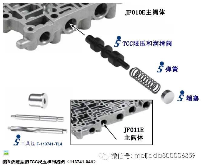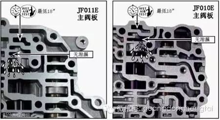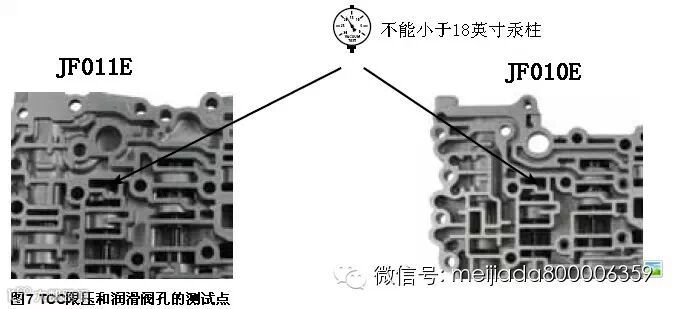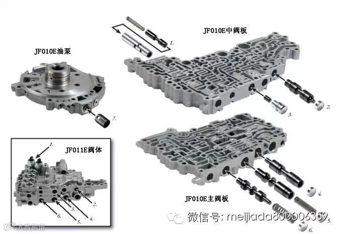 图1中是JF010E和JF011E的阀体,其中列出的6处部位就是这2款阀体的易损部位。虽然它们在两款阀体中所处的位置不同,但零件是完全相同的。只是在JF010E的油泵上还有一处易损部位。