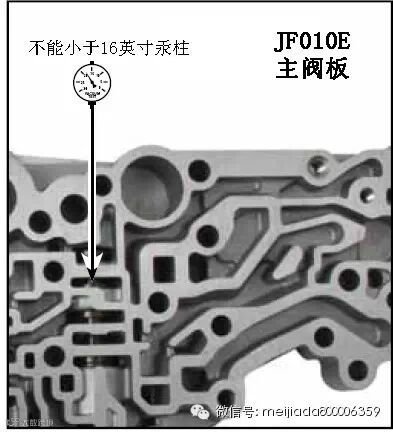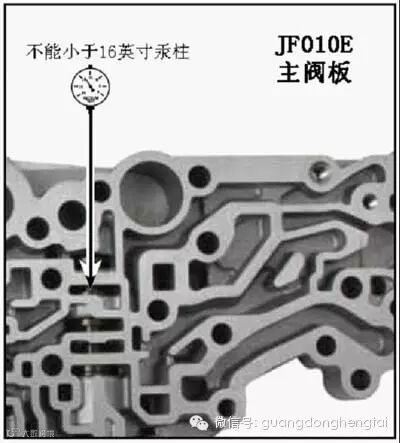 次滑轮上的压力由次滑轮控制阀来控制。维修实践表明,这里的失效形式主要是由于次滑轮控制阀孔被阀磨损而导致次滑轮上的压力不足,过低的压力使传动链打滑、颤抖、滑轮表面磨损以及出现金属污染物。此外,压力过低也会使滑轮的直径不再变化,导致传动比无法按要求改变。次滑轮控制阀孔的真空测试位置在图6中标出,此处的真空压力不能低于16英寸汞柱(0.1MPa=30英寸汞柱)。如低于此数值,则需要修复。修复方法为使用专用铰刀F-113741-TL17对已磨损处进行较孔修复,然后配以改良型的次滑轮控制阀。注意JF010E和JF011E所使用的次滑轮控制阀不同(JF010E用的是113741-17K滑阀修包,而JF011E使用的是113741-19K修包),而它们使用的铰刀则是相同的(F-113741-TL17)。