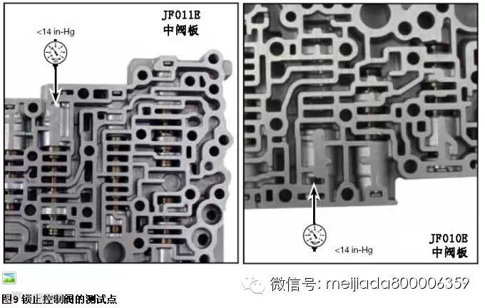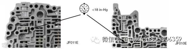 日产CVT的锁止控制中,另一个常见失效点为图1中的#3阀——锁止控制阀和阀套。如图1所示,阀套的内壁容易被内部的滑阀磨损,使锁止油路泄漏,降低了的或完全丧失的锁止油压使锁止离合器接合与释放的时间性被破坏,影响了锁止质量,从而产生了这些常见故障:入前进档时冲击,车辆滑行时出现冲击,在高速行驶时,锁止离合器应该作用而无法锁止,使引擎转速超过正常值。图9显示了对这个锁止控制阀的检测位置。如使用真空测试法,真空压力值不应该小于14英寸汞柱,否则就需要对此处进行修复。修复时只需更换以图10中的阀套和阀芯(113741-11K)即可,无需任何机加工。