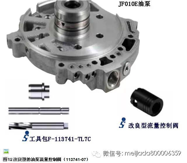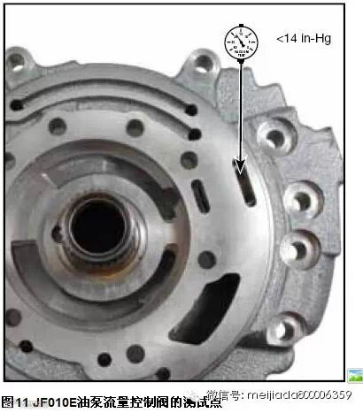 JF010E由于与之所配的引擎排量较大,它的油泵也容易出现油泵输出压力不够的问题,从而导致传动链条带动滑轮的压力不够,出现链条打滑、入前进档和入倒档延迟等问题。JF010E油泵中出问题的地方往往在油泵流量控制阀上(图1中的#7阀),这个控制阀和配合的孔都容易被磨损,而导致油泵压力泄漏。图11显示了对JF010E油泵中流量控制阀的检测点,真空压力小于14英寸汞柱就需要修复此阀,或者更换油泵总成。图12显示了修复此油泵所需的专用铰孔工具和改良型的流量控制阀(113741-07),使之使用寿命更长、更耐用。